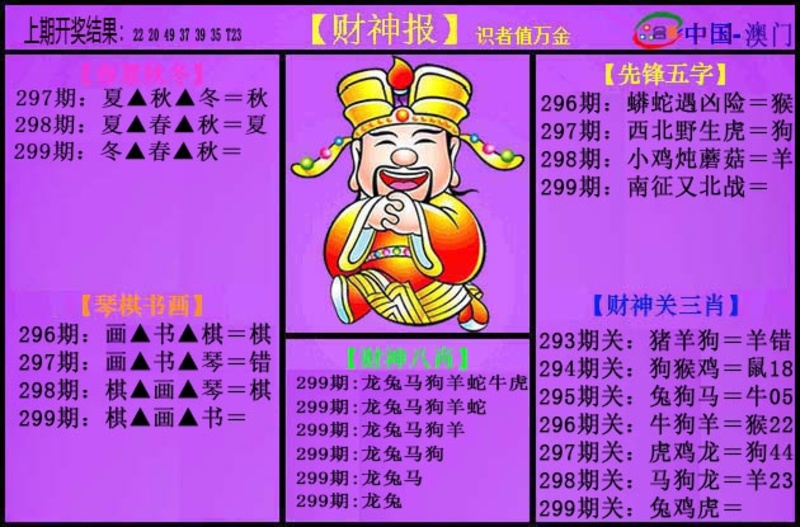| 296期五肖 | 鸡猴鼠龙猪 | 开:猴22 |